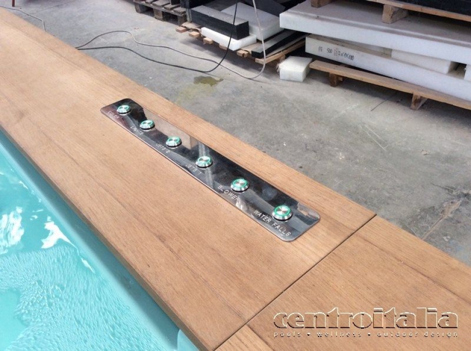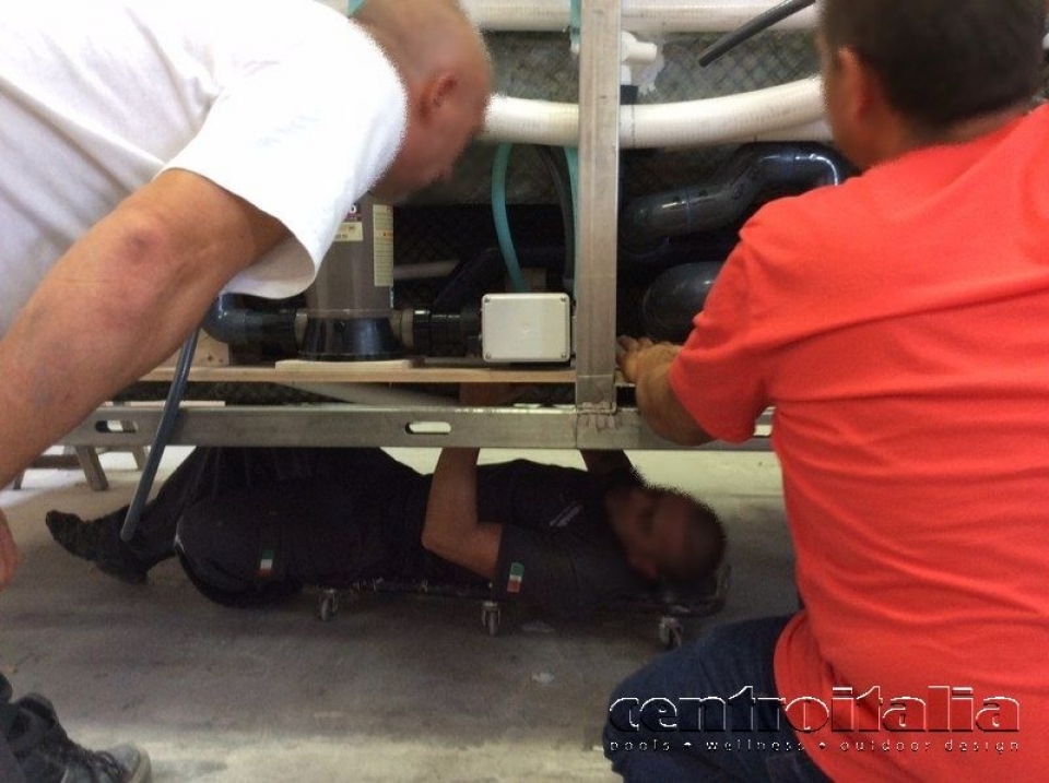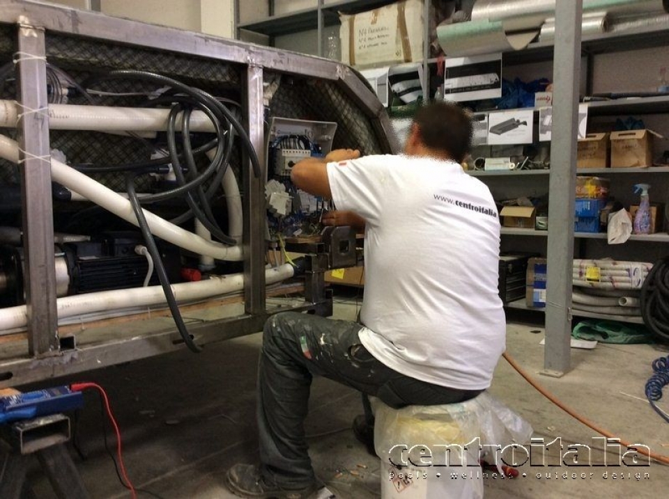 - Messa in opera degli impianti di filtrazione, trattamento con additivi, di idromassaggio, insuflaggio, ricircolo, quadri elettrici, illuminazione con striscia di fibre ottiche immersa e riscaldamento