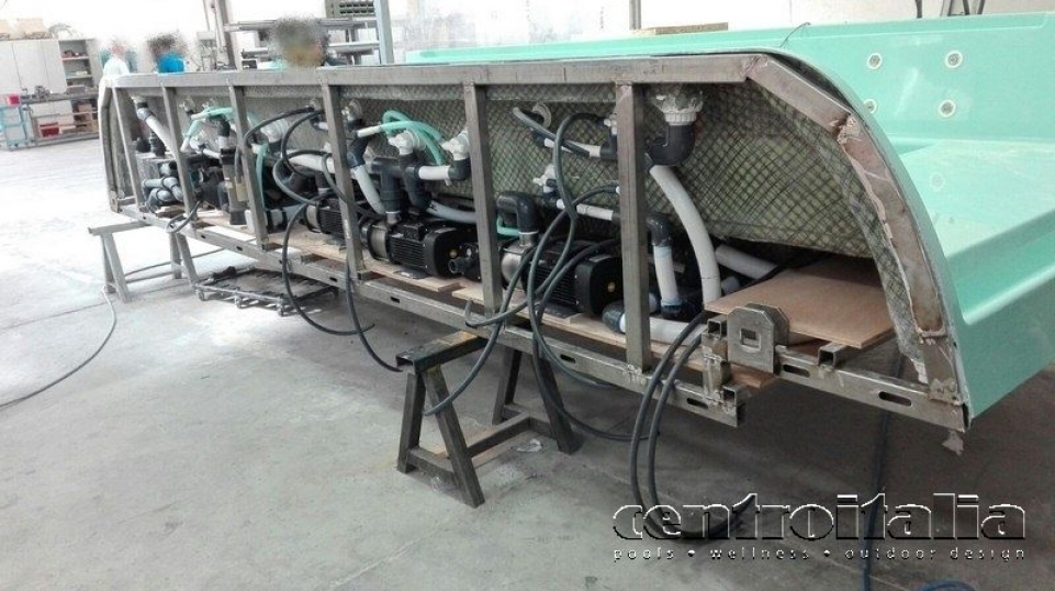 Il progetto, sotto la responsabilità del team guidato da Cristiano Gatto, è consistito nello sviluppo di una vasca di forma rettangolare di 590 cm x 245 cm x 75 cm. L'impianto è stato arricchito con due cristalli curvi a cascata sui lati ed un impianto di idromassaggio misto. Abbiamo inserito un impianto di illuminazione di alto design con l'aggiunta di strisce ottiche RGB posizionate sul fondo ad adornare il perimetro della vasca.